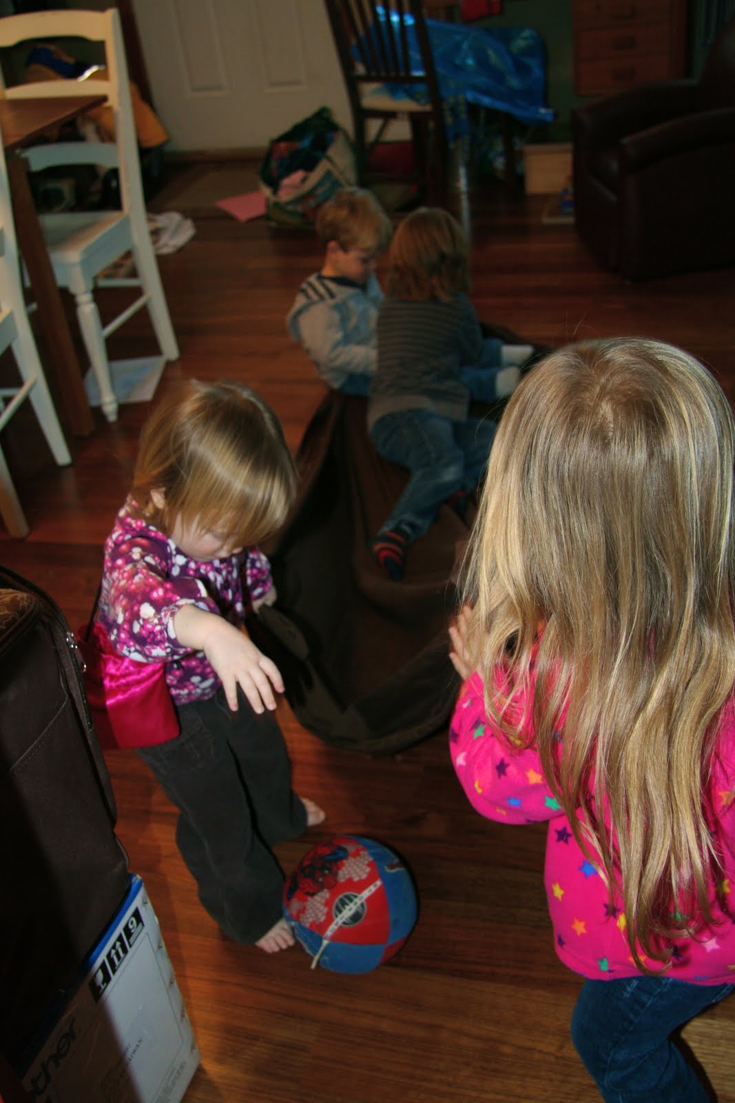 We played a version of our Laundry Basket Puzzle game (another heavy work activity) - this was the Sheet Puzzle Game. Puzzle pieces on one end of the room, puzzle board on the other end. The kids took turns pulling each other back and forth; collecting puzzle pieces and placing them in the puzzle board.